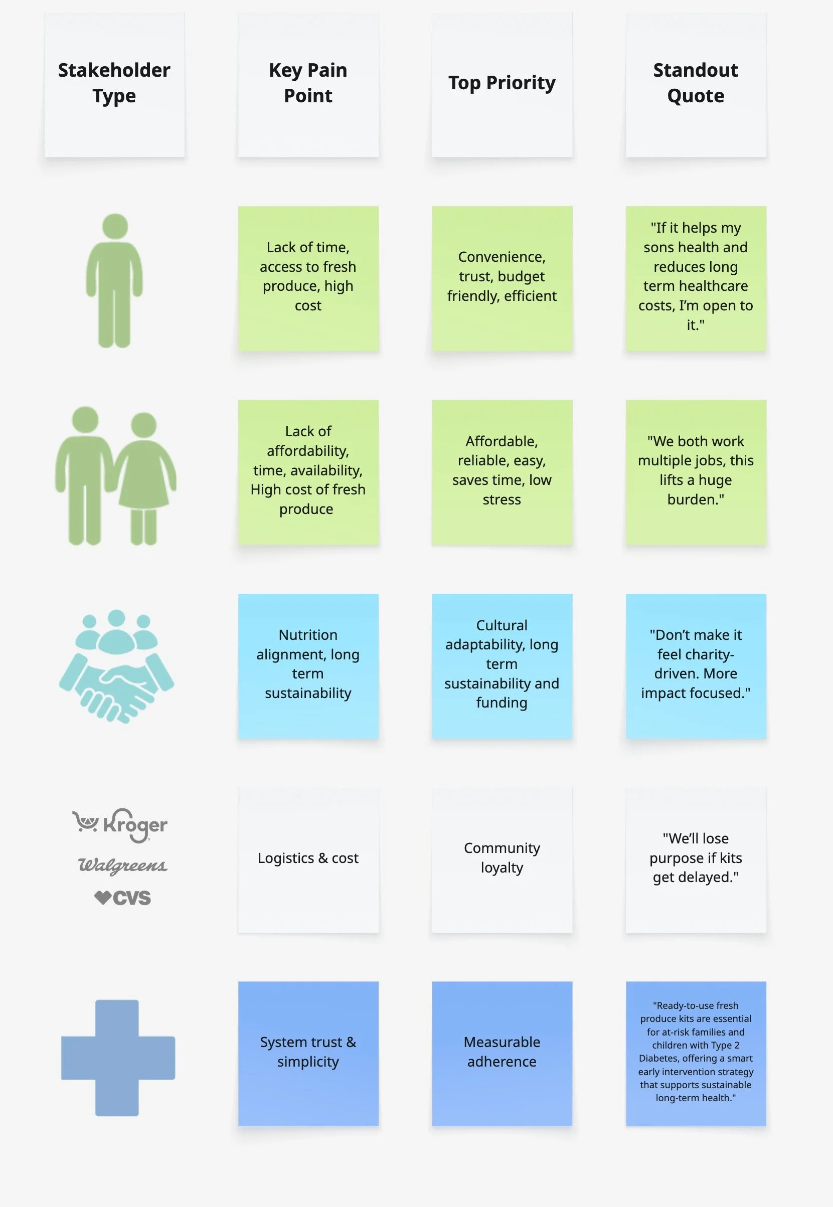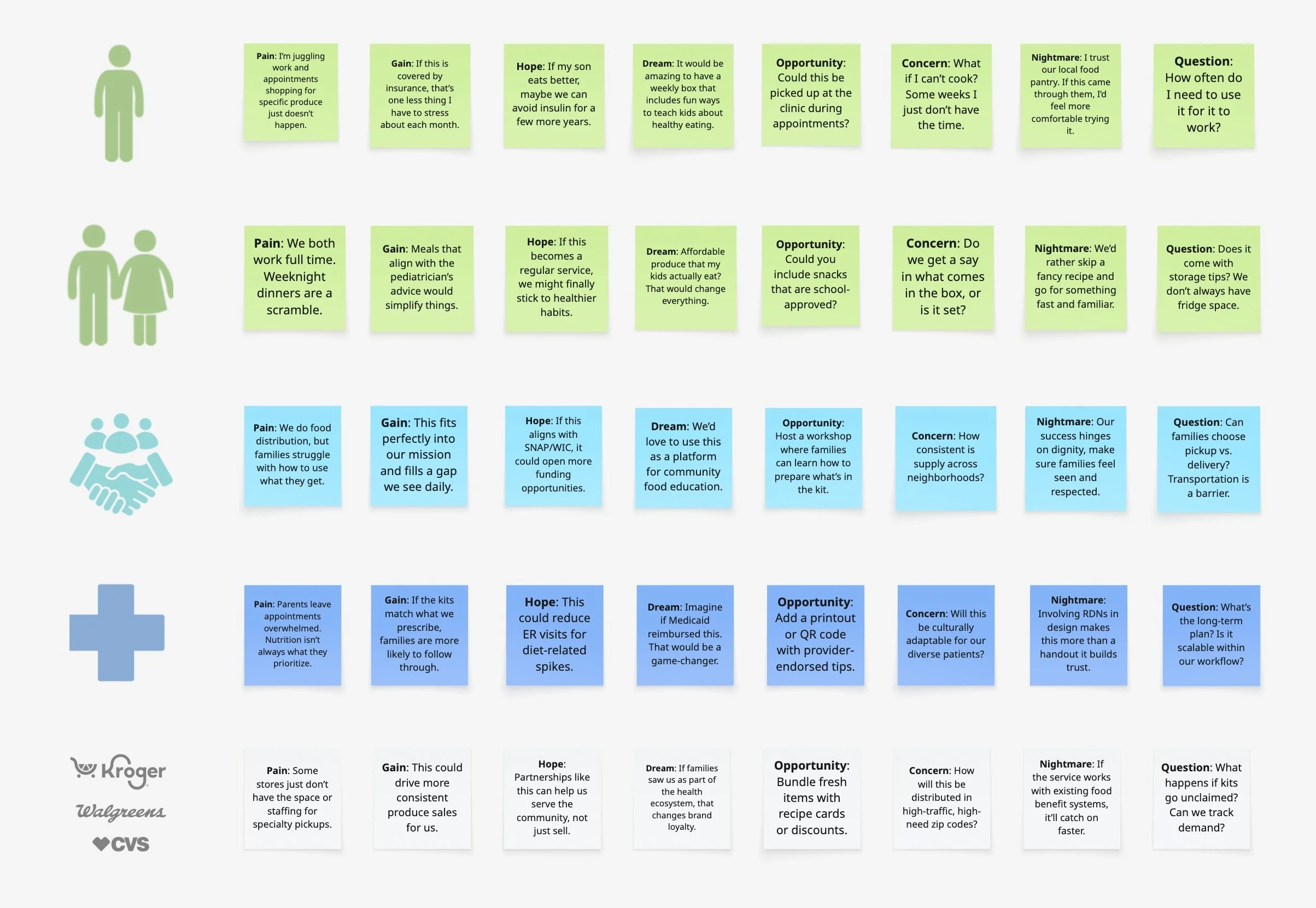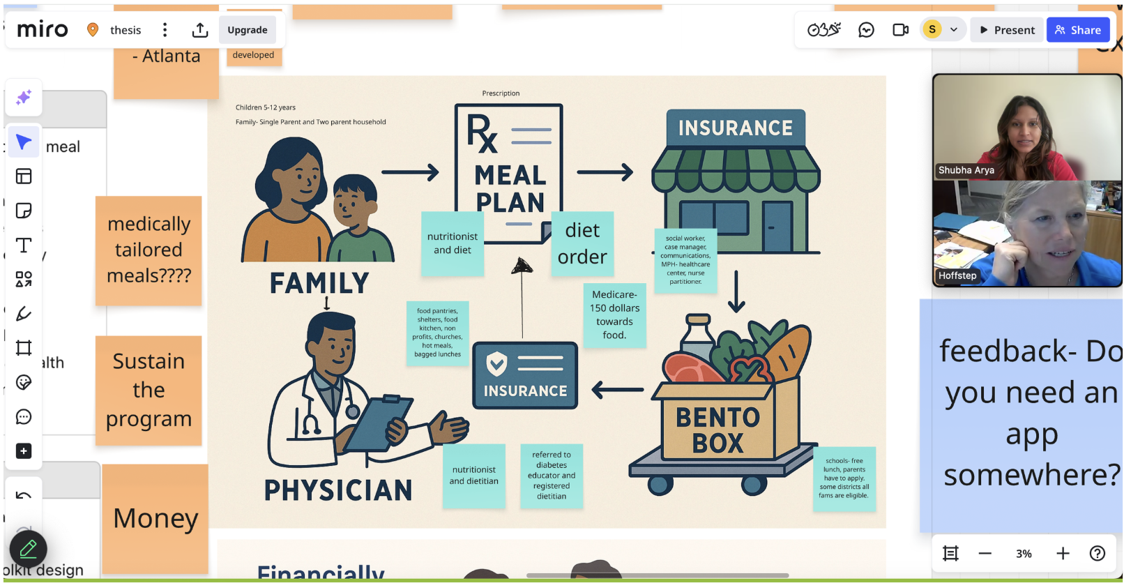 Validated concepts with 8 cross-sector stakeholders (public & private healthcare, nonprofit leadership, and food retail partners) through collaborative Miro workshops